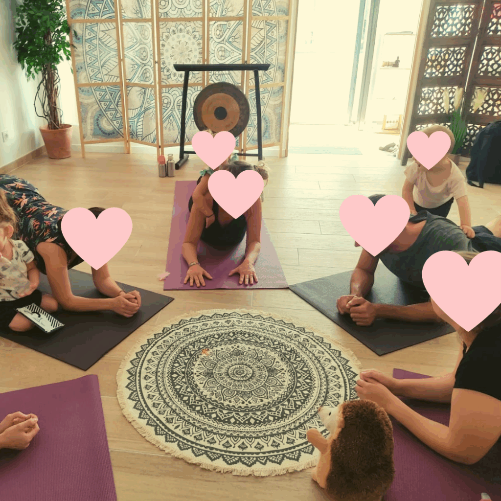 Côté atelier parent/enfant, je propose des séances d’une heure, combinant respirations, histoire ponctuée de postures simples, ainsi que des jeux permettant aux parents et aux enfants de prendre du plaisir ensemble.